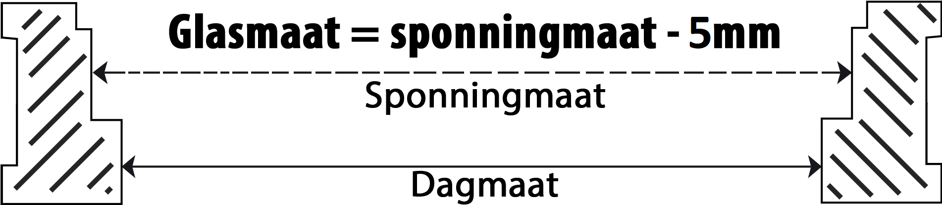De sponningmaat is de strakke maat van het kozijn waar het glas in komt. Hier wordt een speling van 5 mm gebruikt. De 5 mm is benodigd voor de ventilatieruimte rondom de ruit en hier wordt dus meestal 2.5 mm per zijde voor genomen. Vandaar een aftrek van 5 mm horizontaal en 5mm verticaal.
